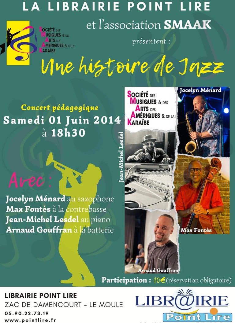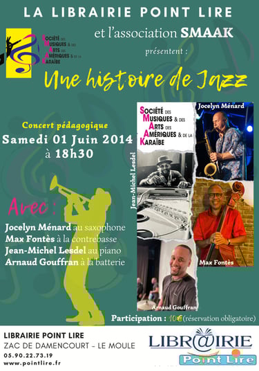 Le 1er juin 2024, la librairie Point Lire s'associe avec SMAAK pour vous proposer un concert pédagogique autour de l'histoire du Jazz.
