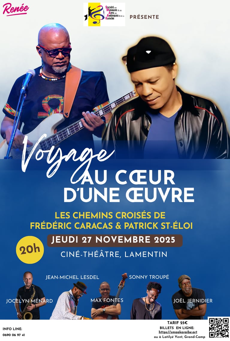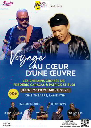 Le 27 novembre 2025, au Ciné‑Théâtre du Lamentin, SMAAK vous invite à vivre une expérience rare : Voyage au cœur d’une œuvre, un concert-rencontre qui allie mémoire, musique et transmission. Cette soirée est conçue comme un cheminement artistique entre passé et présent — une invitation à (re)découvrir l’œuvre de Patrick Saint‑Éloi, éclairée par sa complicité musicale avec Frédéric Caracas.